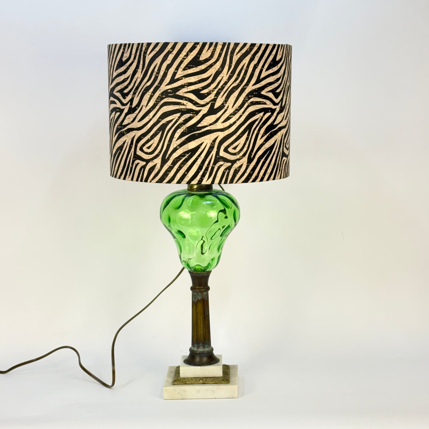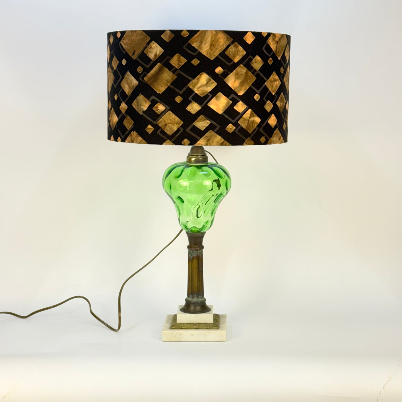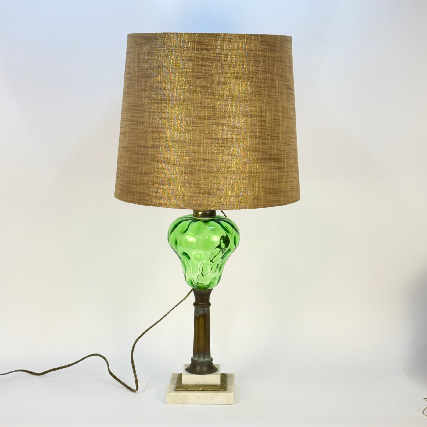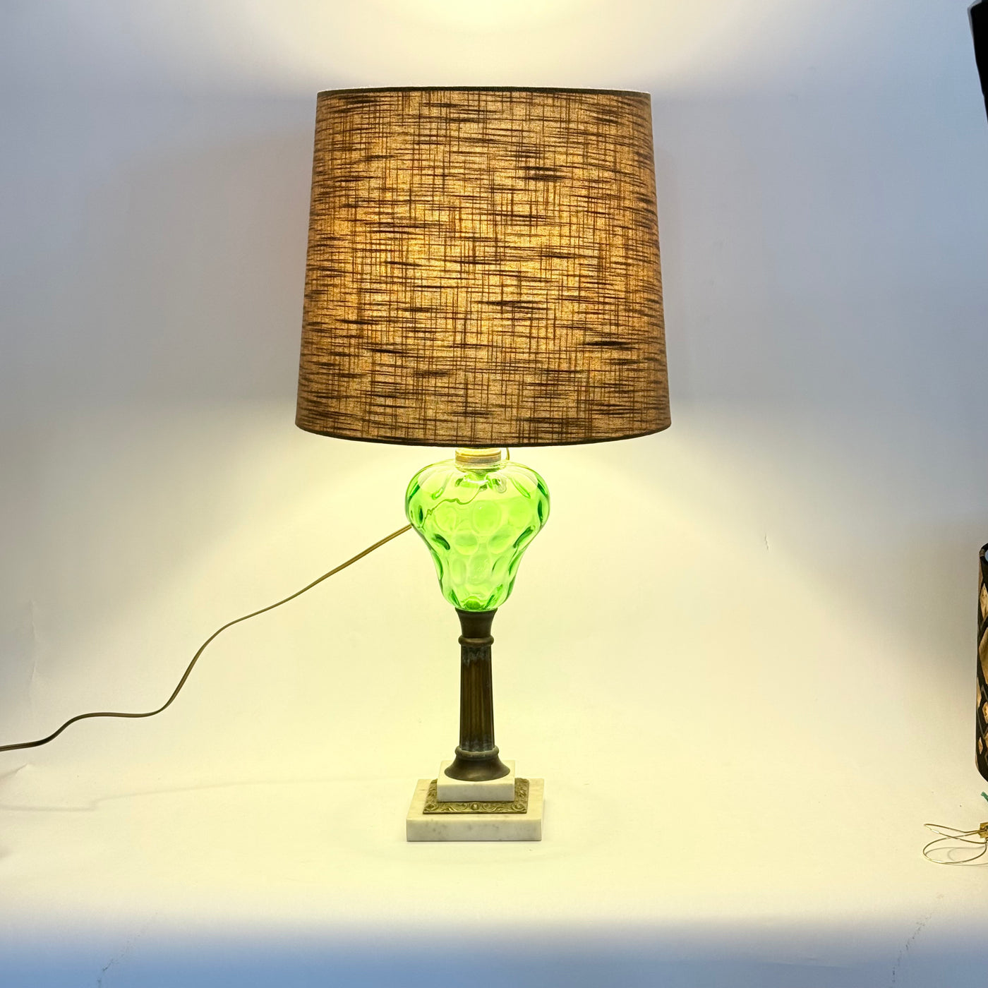 This lamp is an electrified oil or kerosene lamp. The brass has a lovely patina! The emerald green glass has a thumbprint pattern in the glass. The base is marble.