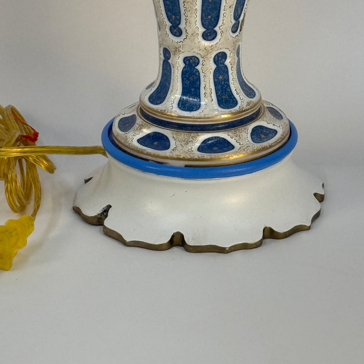 This lamp is an amazing one if a kind find! It is French blue Opaline glass with white and gold accents.