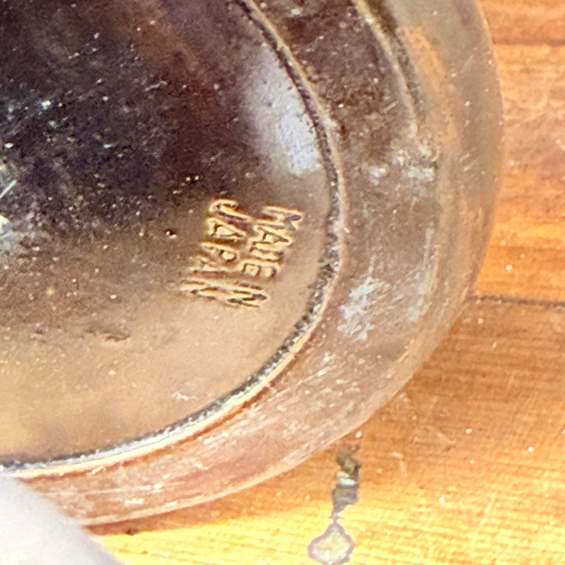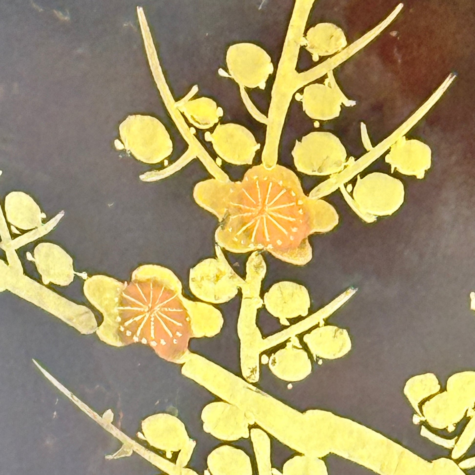 While it has certainly seen better days, I have a thing for brown and the metallic cherry blossom design is just fabulous. There are several spots where the finish has been scratched and the color is gone. This is wear consistent with it's age, and I like to think it tells a story of a previous life!