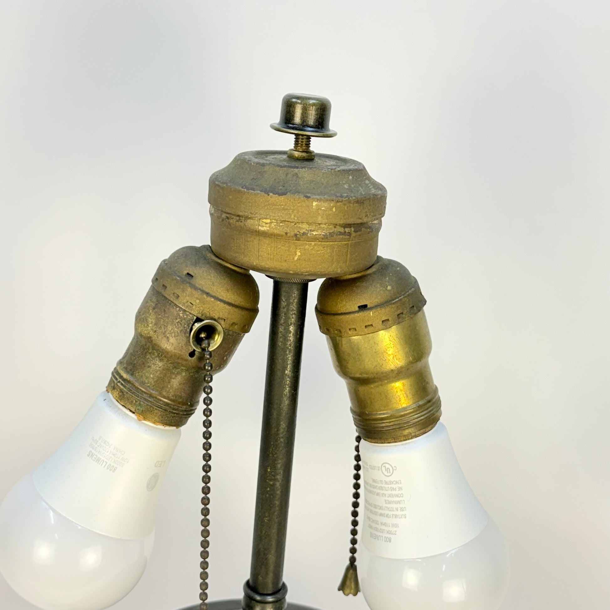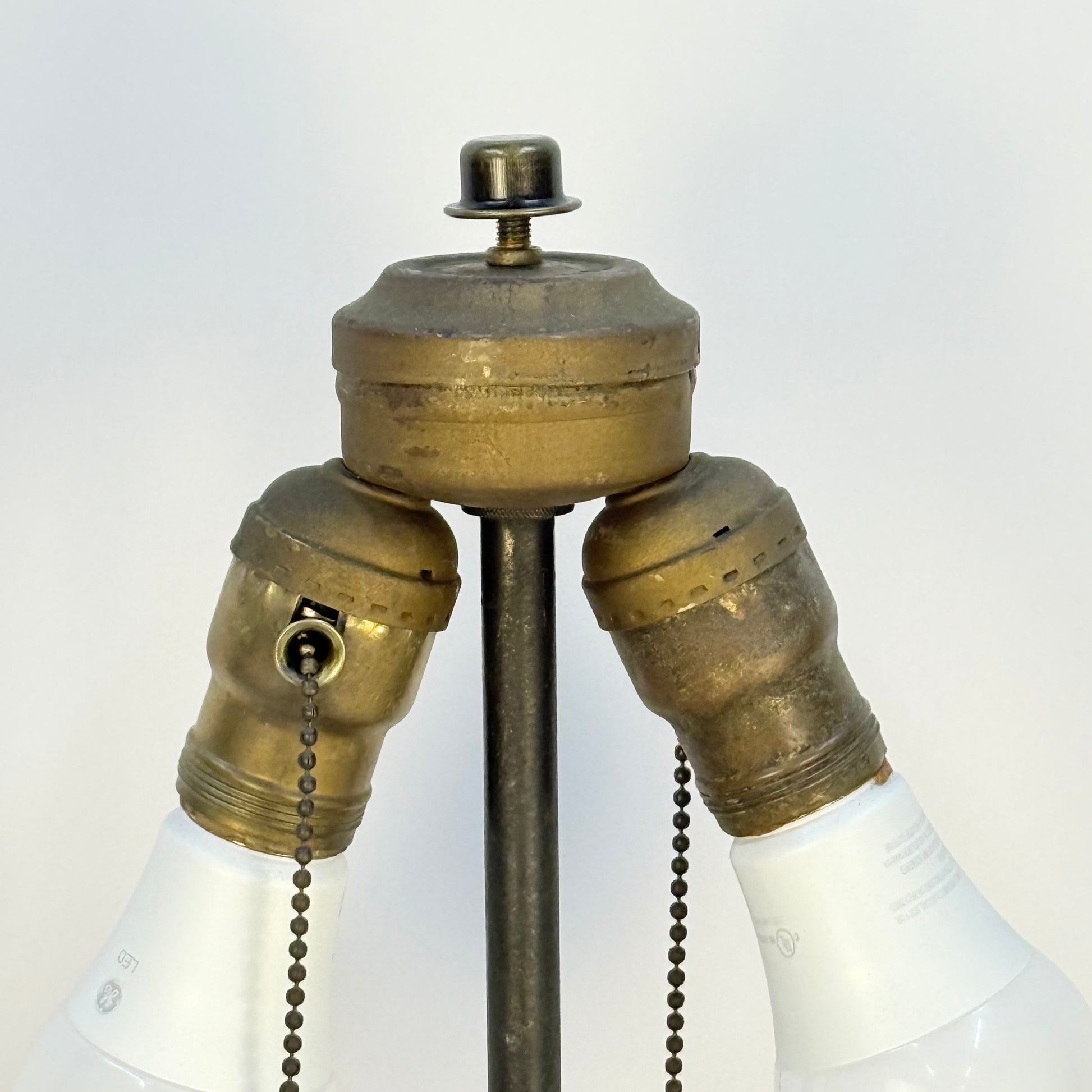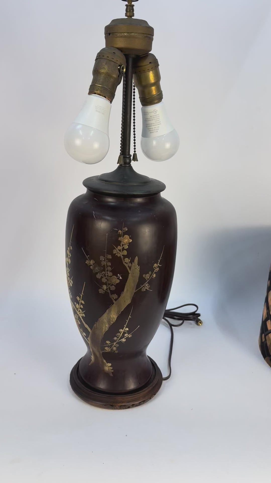 The lamp sits on a round wood base. It has new wiring, though the old sockets and covers were salvaged as they were in good condition.
